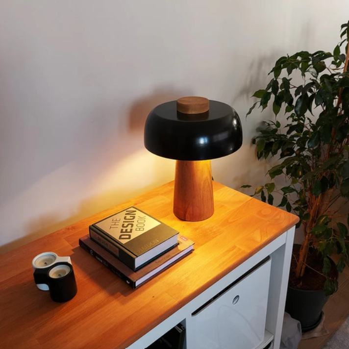 ahşap gövde ve metal başlık ile satışa sunulan masa lambası farklı renklerle sunulmaktadır.