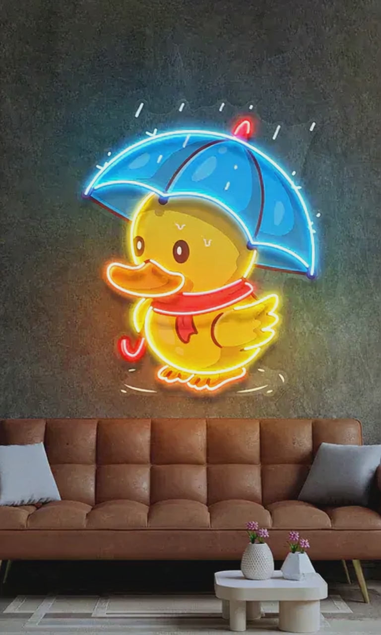 Şemsiye Ve Ördek Neon Lamba, eğlenceli ve renkli tasarımıyla her mekana neşe katıyor. Şemsiye altında saklanan sevimli ördek, özellikle çocuk odalarında harika bir dekoratif parça. Eğlenceli atmosferler yaratmak için idealdir.