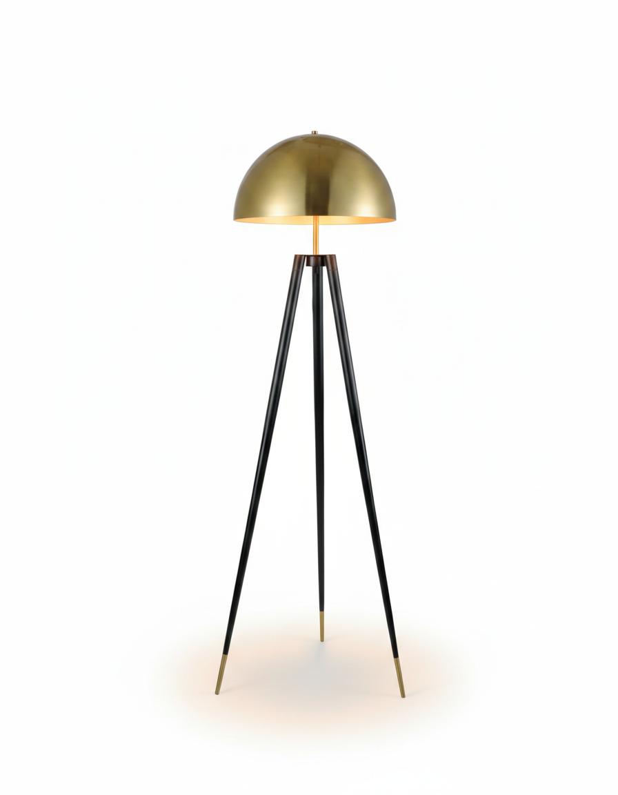 Bu özel tasarım lambader, mat siyah renkteki üç ayaklı (tripod) gövdesiyle sağlam bir duruş sergilerken, fırçalanmış gold detaylarıyla göz doldurur. Yarım küre formundaki gold metal başlığı, ışığı yumuşak ve kontrollü bir şekilde yayarak mekanınızda sıcak bir ambiyans oluşturur. Ayak uçlarındaki gold detaylar, tasarıma bütünlük ve zarafet katar.