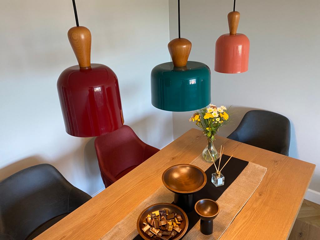 Atolye'nin Rainbow serisi 3 farklı boyda ve onlarca farklı renkte üretilen metal ile ahşap materyalin buluştuğu tekli sarkıtlar serisidir.